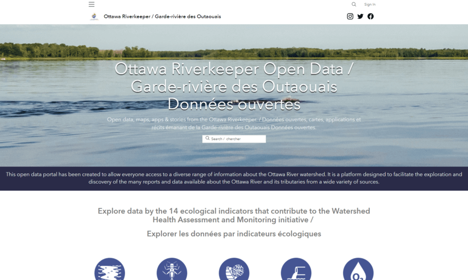 Our open data portal has been created to allow everyone access to a diverse range of information about the Ottawa River watershed. It is a platform designed to facilitate the exploration and discovery of the many reports and data available about the Ottawa River and its tributaries from a wide variety of sources.