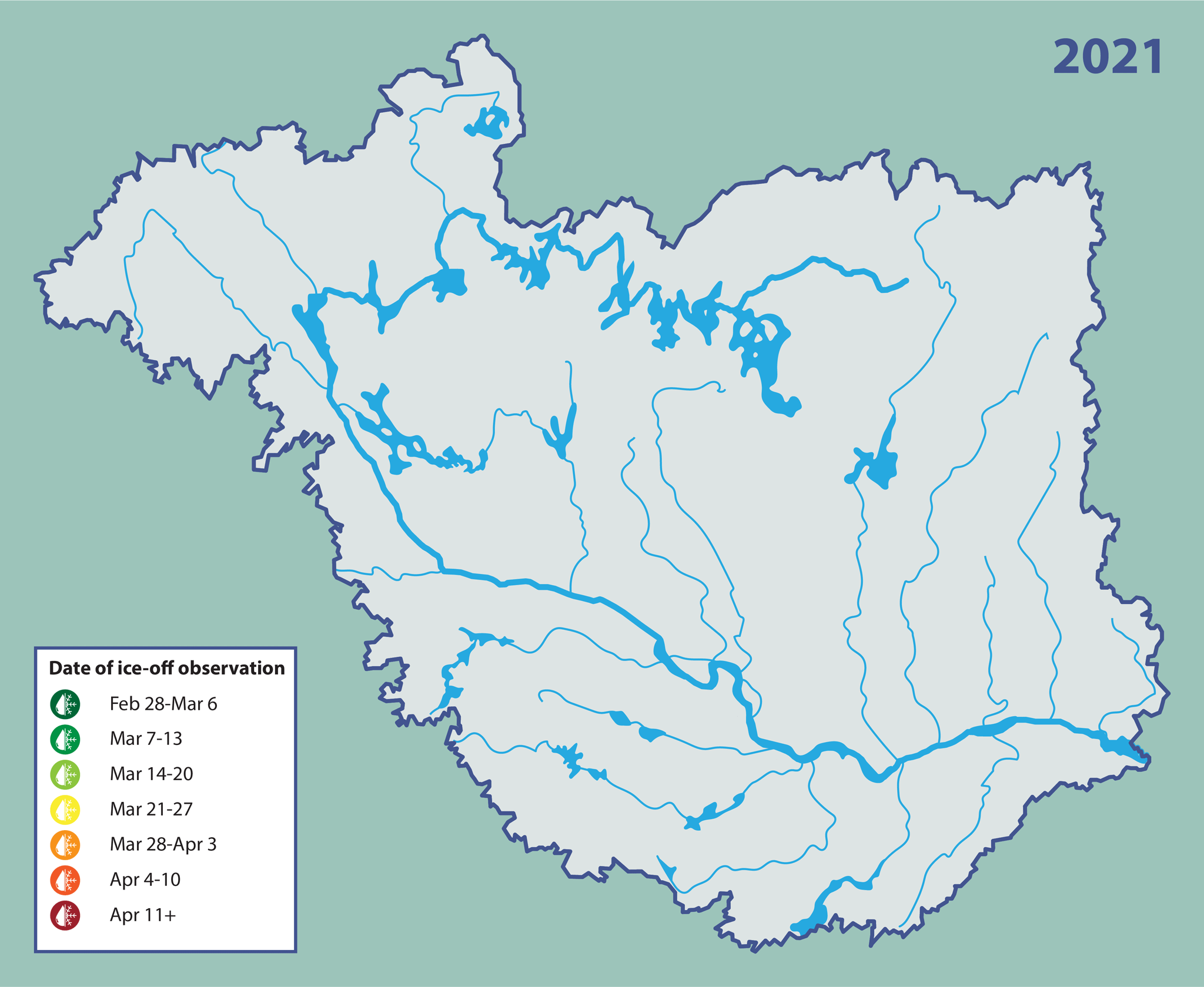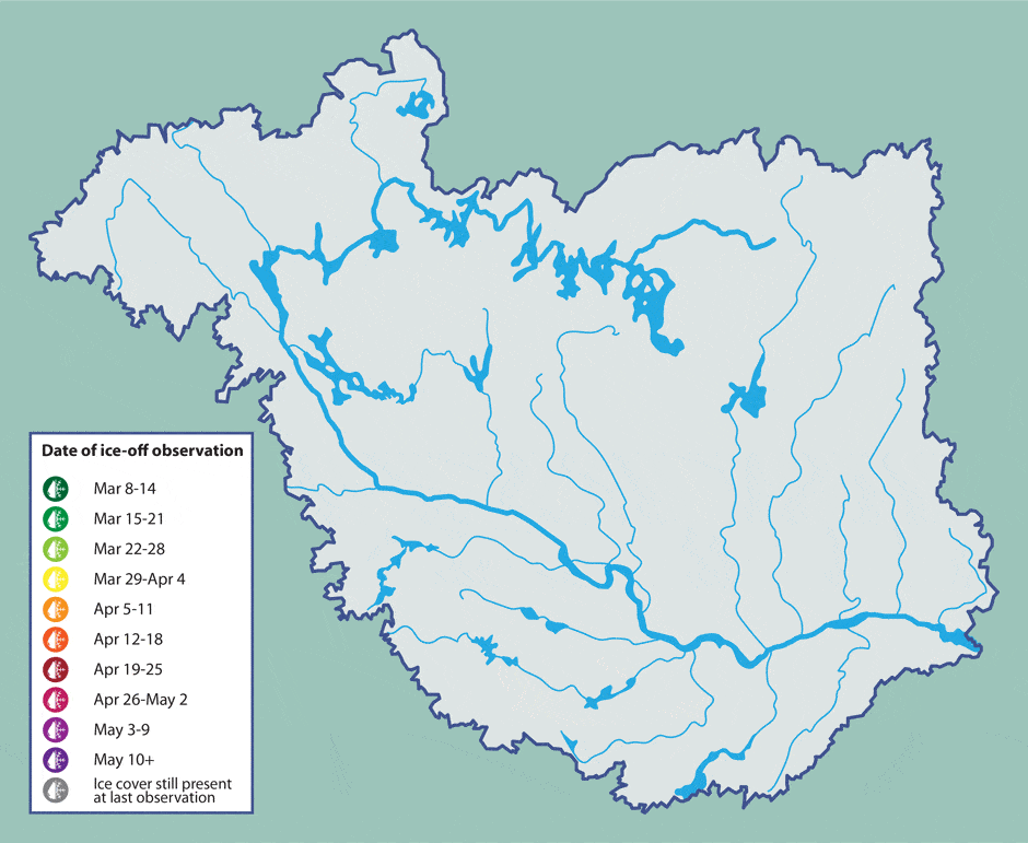 We’ve been asking you to let us know when you see ice off conditions in your part of the watershed, and so far we’ve received a ton of responses! This map shows when and where citizens of the watershed have sent us their observations, and will continue to be updated as new observations come in.