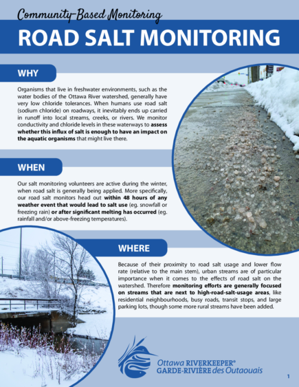 In early 2020, Ottawa Riverkeeper piloted a new community based monitoring initiative, to find out if winter salt use was leading to harmful chloride levels in creeks in Ottawa and Gatineau. With the help of five citizen scientists volunteers we were able to collect data from five creeks receiving road salt runoff, to gain a better understanding of how winter salt may be affecting chloride concentrations. Even though we expected to see high concentrations, we were still shocked by the results.