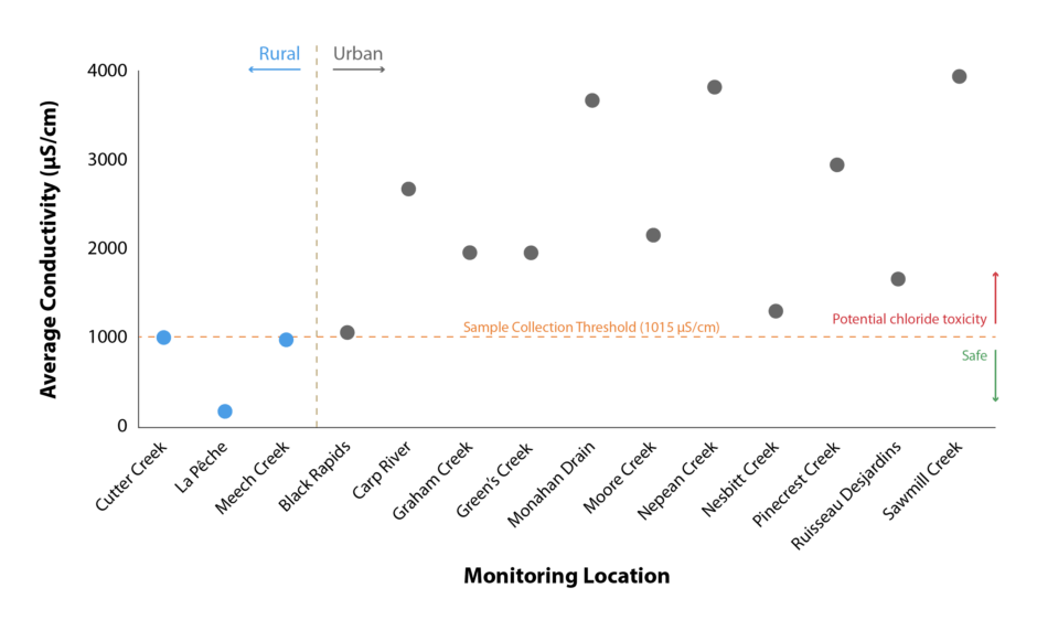 Overwhelmingly, chloride concentrations in Ottawa and Gatineau creeks become elevated during the winter months and pose a danger to local freshwater life. Our monitoring program has expanded over the years to include new sites, however we have also continued our monitoring year-after-year in sites with the most troubling trends.