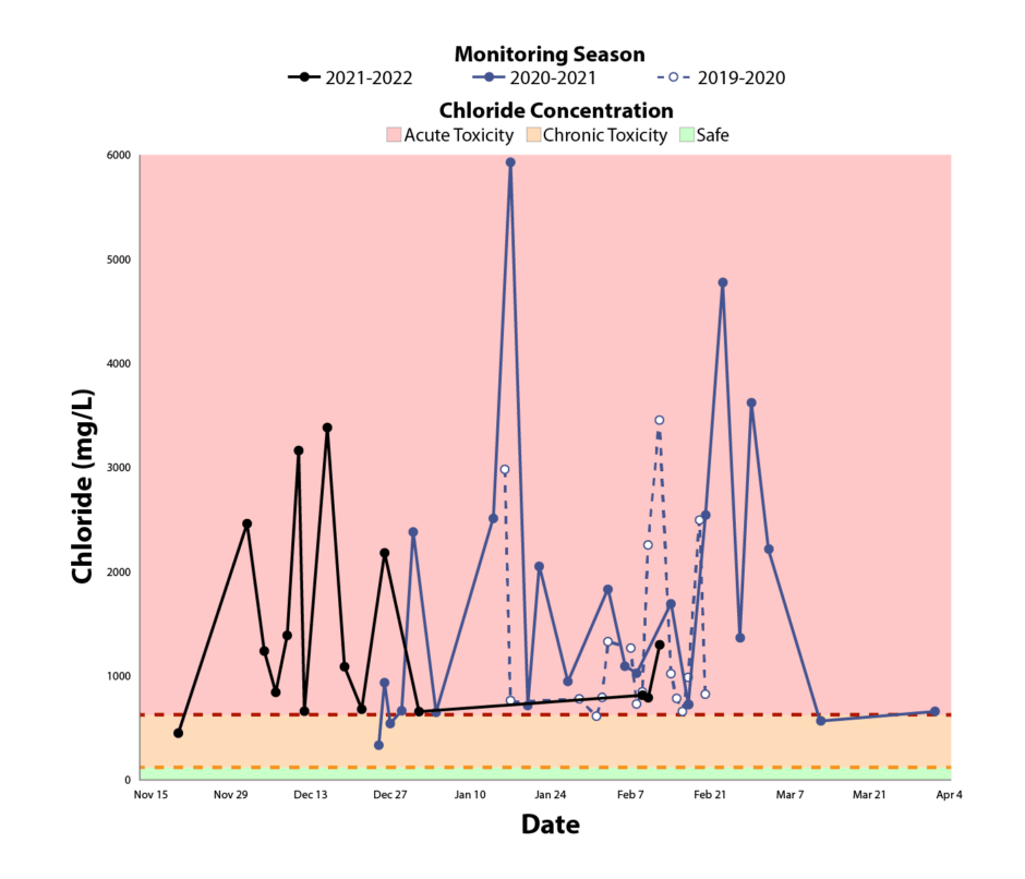 In March 2021 we officially published a report summarizing our findings, which clearly showed that chloride concentrations were well above levels that are considered safe for freshwater life.